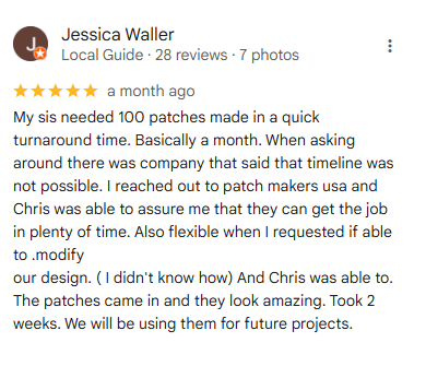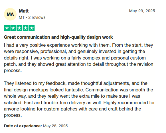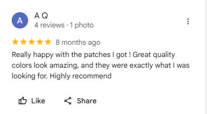 Our customers love the quality, durability, and care we put into every patch. From fast delivery to friendly support, here’s what they have to say about their experience with us